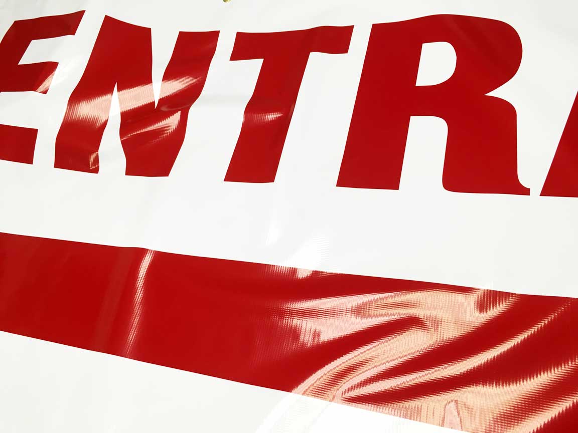 (1) 36"h x 96"w High quality banner with reinforced sewn edges and grommets. This white banner has large text that reads "ENTRANCE" with a large right arrow.