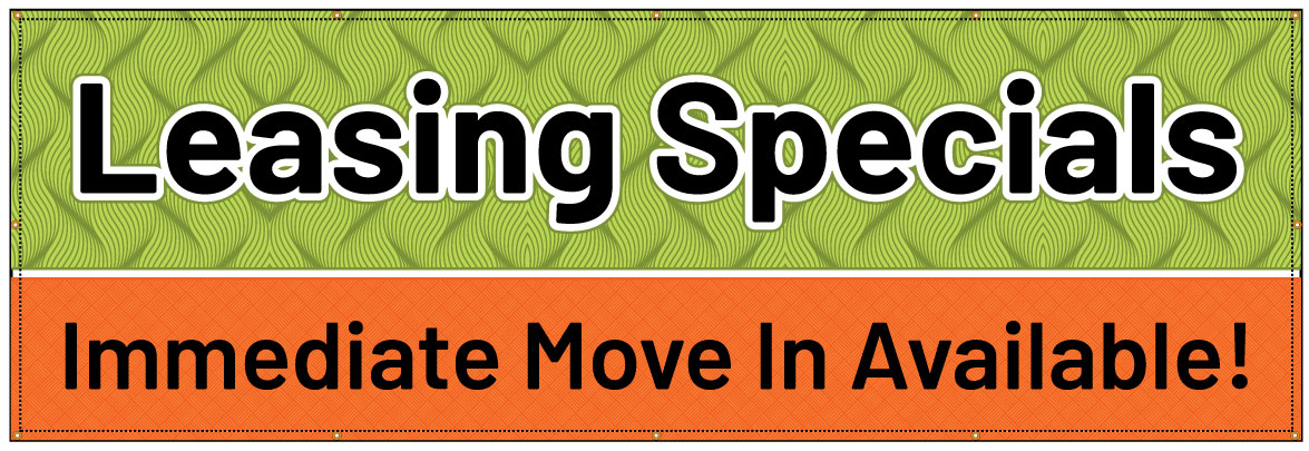 (1) 48"h x 144"w High quality banner material with reinforced sewn edges and grommets that reads "Leasing Specials, Immediate Move In Available".