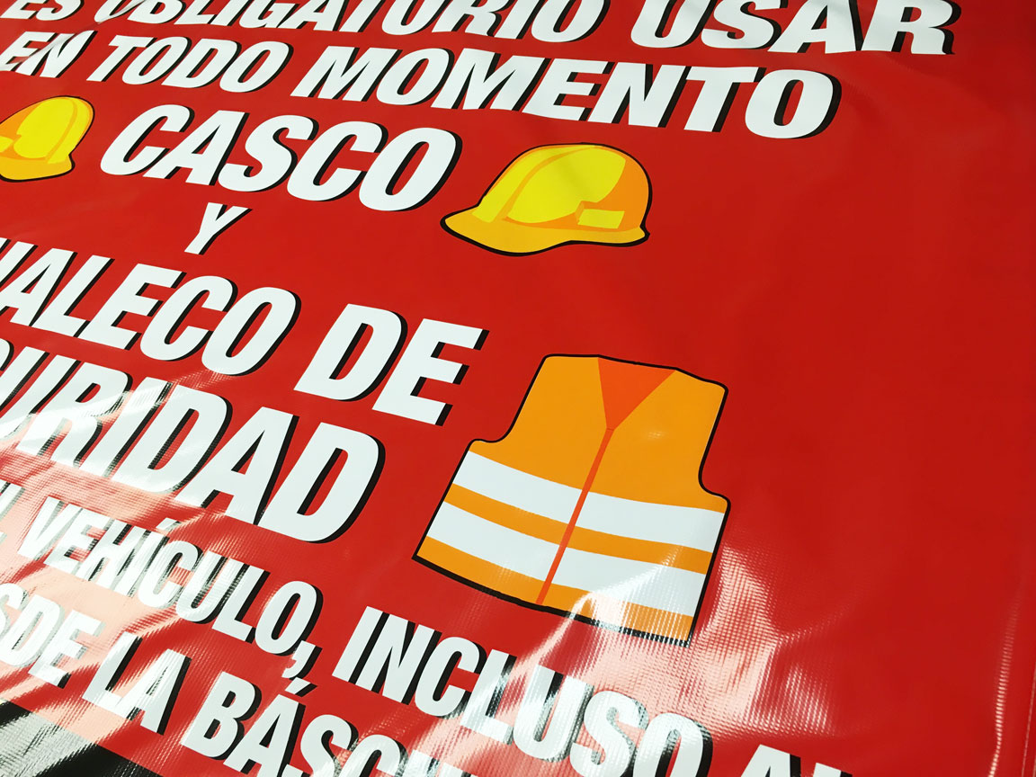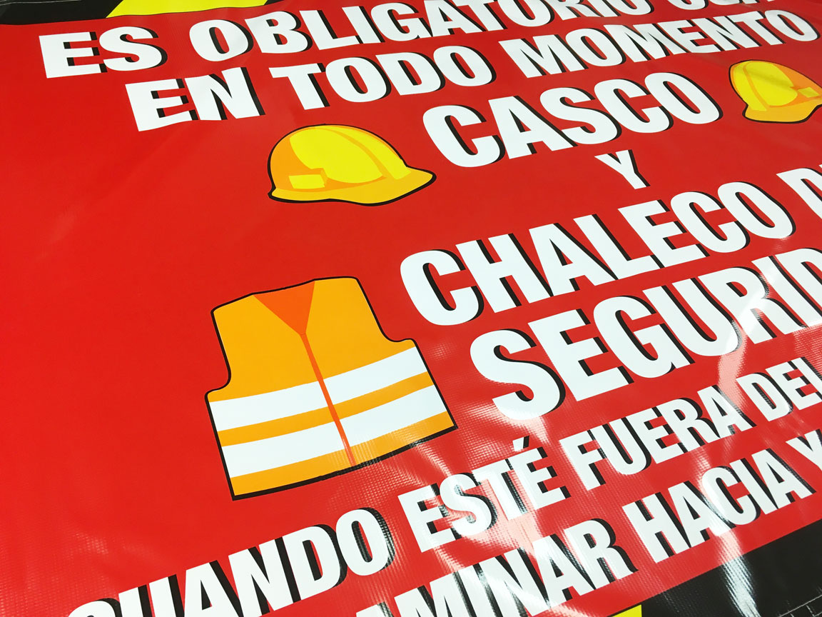 Buy this 48"h x 72"w high quality banner with grommets that translates from Spanish to read "Required at all times: Wear Your Hard Hat and Safety Vest When Outside of Your Vehicle, Including When Walking To and From the Scale House" in a bold red, yellow and black design with caution stripes along the top and bottom.