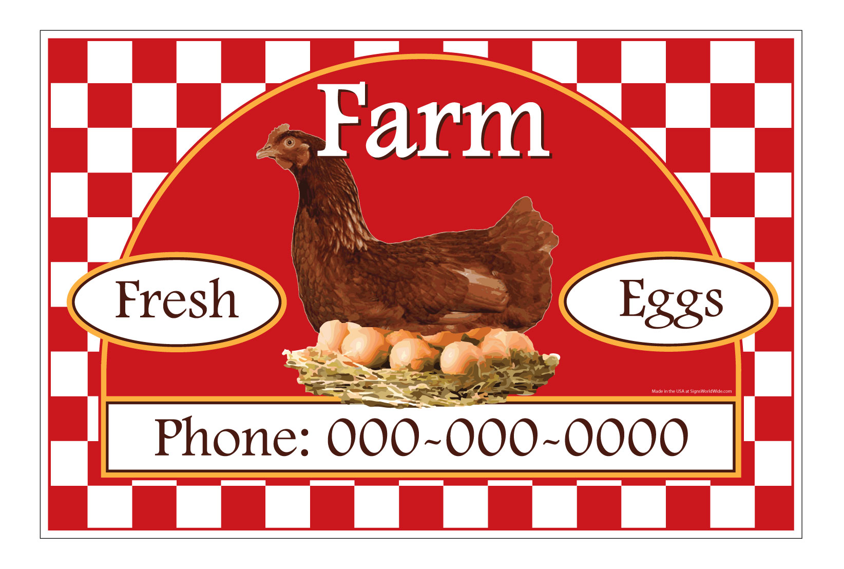 (1) 24"h x 36"w x .080 Aluminum sign with colorful text that reads "Farm Fresh Eggs For Sale ~ Phone: (Phone Number)." The sign can be single or double sided. Choose the preferred style from the drop down menu.