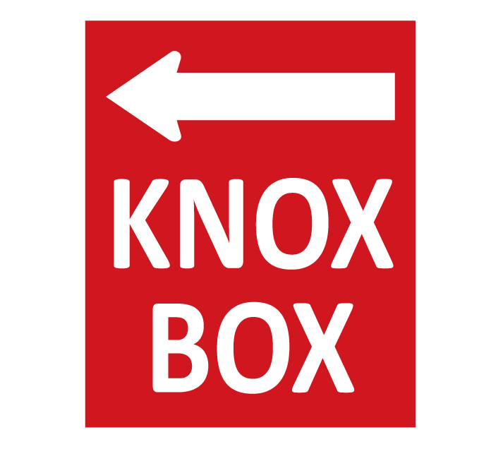 (1) 8"h x 6.5"w x .080 single sided aluminum sign with reflective background that reads: "(Left Arrow) KNOX BOX." Text is 1.75"h.