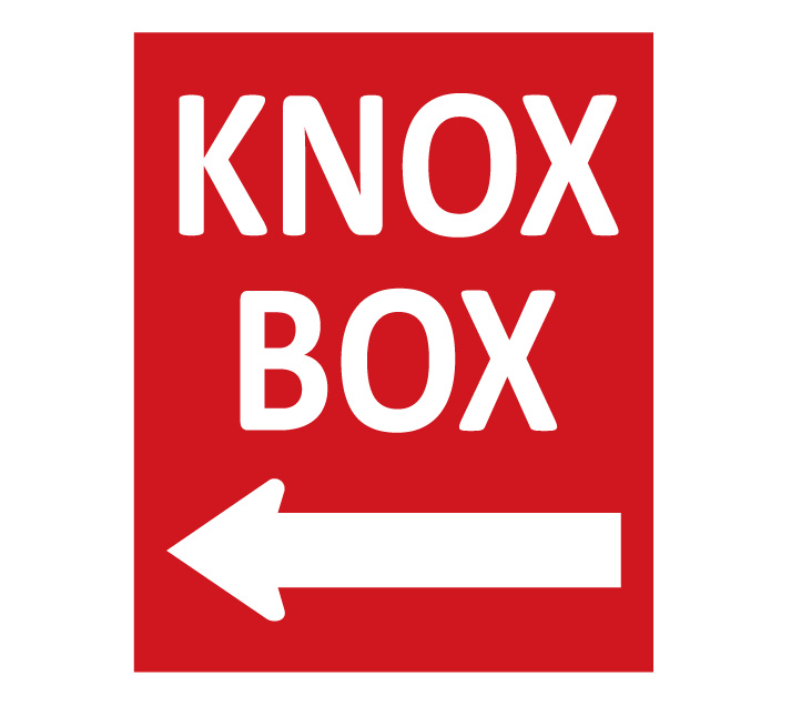 (1) 8"h x 6.5"w x .080 single sided aluminum sign with reflective background that reads: "KNOX BOX (Left Arrow)." Text is 1.75"h.