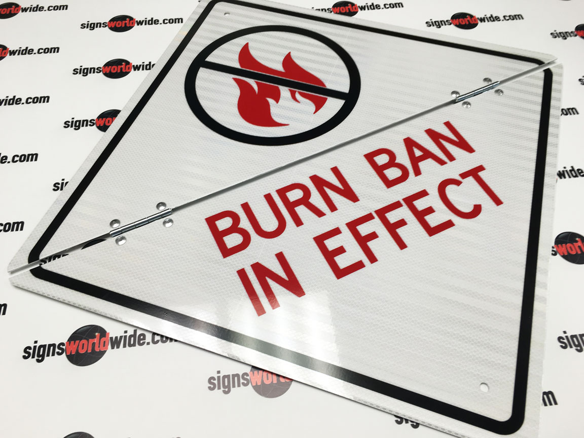 (1) 24"h x 24"w x .080 Aluminum square turned 45 degrees to make a diamond shape that is approximately 34"h. The graphics on the sign read "(Fire Graphic Crossed Out), Burn Ban in Effect". Choose between a non-reflective or an engineer grade reflective white background.