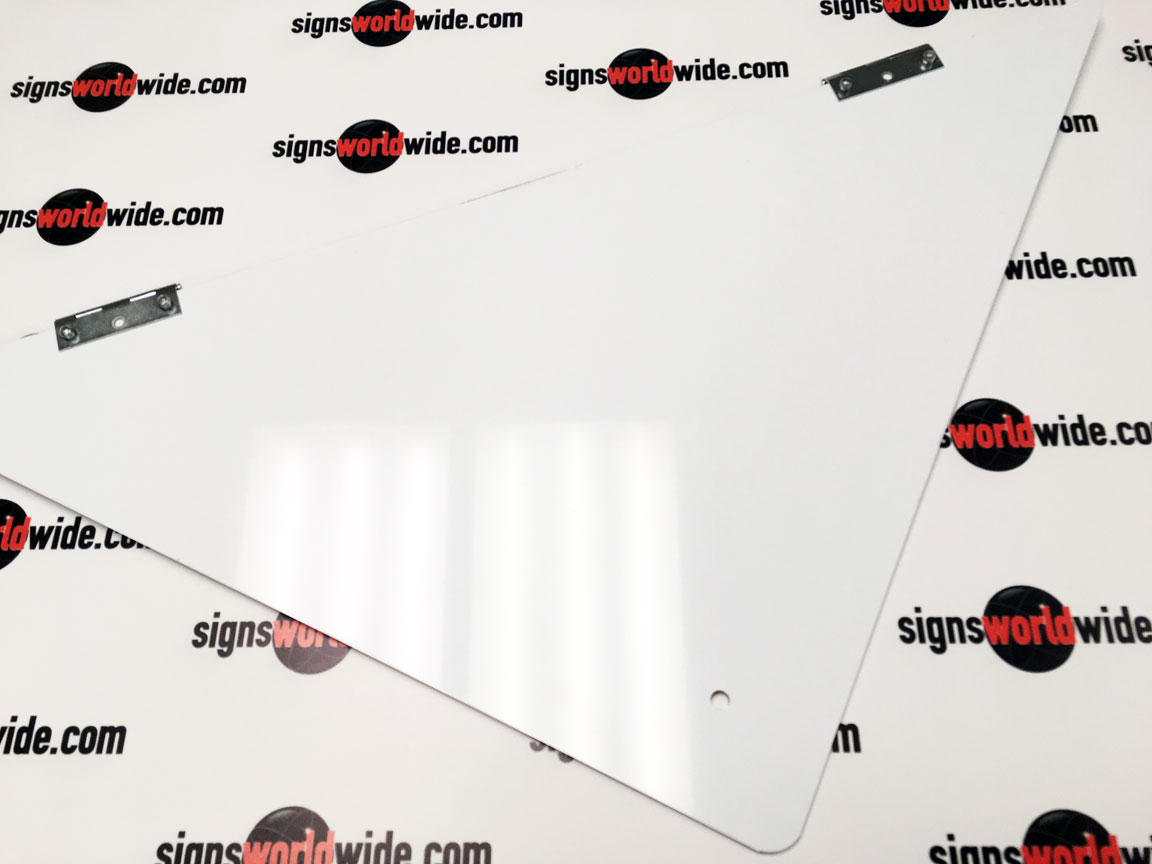 Signs feature 1" radius corners and two pop-riveted steel hinges that allow the sign to be closed into a triangle shape. Two holes are included, one on each half. Hinge design may vary from the image shown. If you do not wish to have us provide hinges, you can make the proper selection from the drop down menu labeled "hinges." The sign faces will come without any hinges or holes.